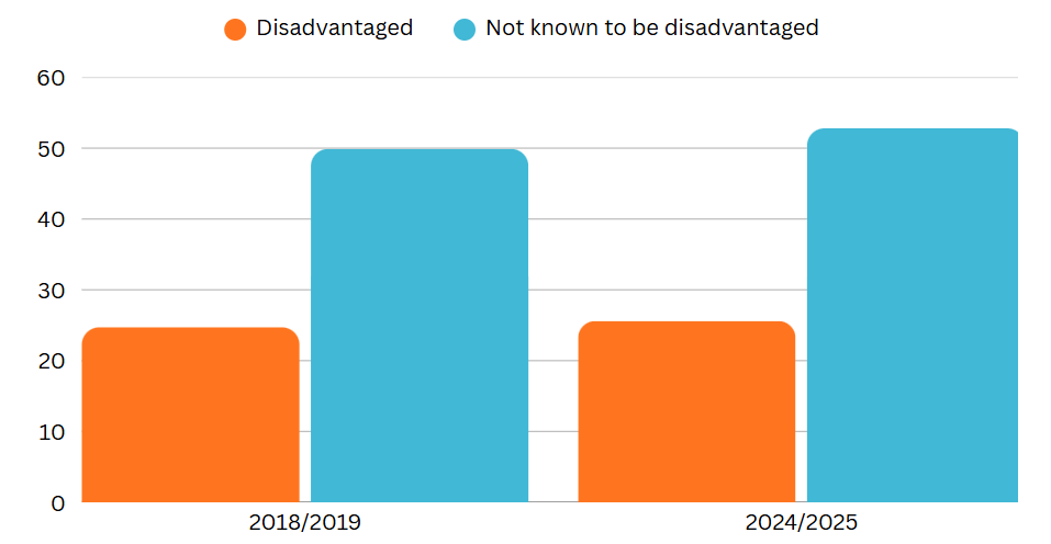 The consequences of deprivation on education outcomes is substantial. In 2024/2025, the national average of disadvantaged, state school students achieving grades 5+ in GCSE Maths and English was only 25.6%, whilst students who are ‘not known to be disadvantaged’ had a national average of 52.8%.