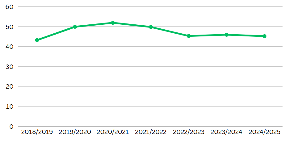 When analysing the national average of state-educated pupils achieving this, the levels have remained somewhat steady over the last 7 years, and in fact there has been a 2% improvement. In 2018/2019, 43.2% of students attained grades 5+ in English and Maths GCSEs compared to 45.2% in 2024/2025.