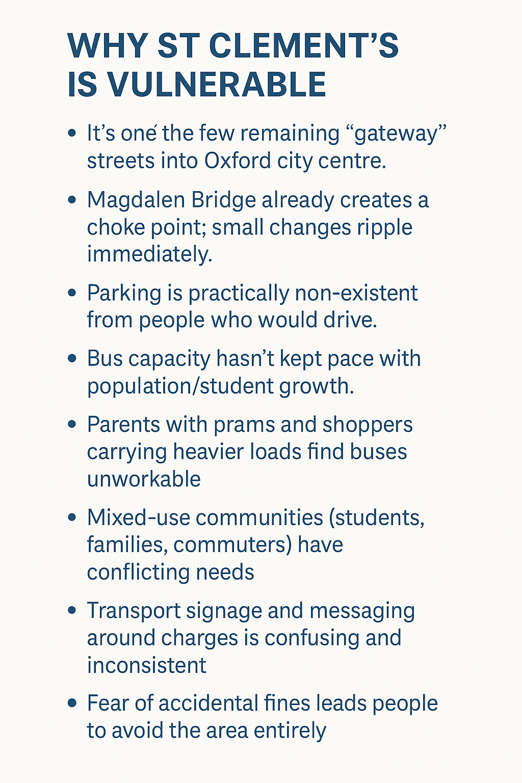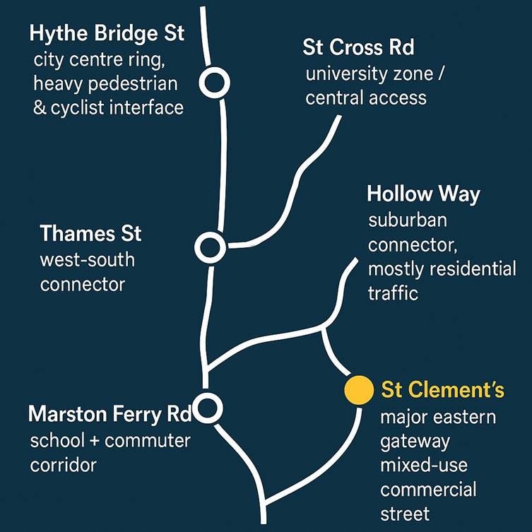St Clement’s is one of six roads included in the temporary charge, handling commuters, residents, students and heavy bus traffic. In addition, there’s sparse parking, LTNs and bicycle lanes. It all adds up to small policy changes having a huge impact.