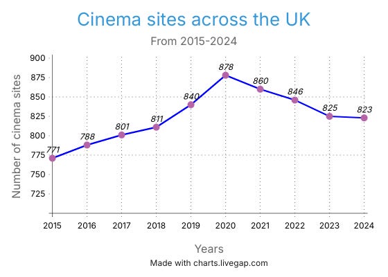 With the rising operating costs and the increase in streaming services, cinemas are closing nationally. This year alone, 10+ cinemas have closed, 7 being Cineworld and 3 being Odeon. This doesn’t account for the local cinemas that too weren’t able to keep up with increasing costs and the shift towards streaming services. However, according to the UK Cinema Association in 2023, there were 825 sites compared to the 823 sites in 2024. This small decrease is due to the opening of new cinemas, so although there is an increase in closures, there is hope for the fact that new cinemas are opening. This however, still doesn’t match the peak in 2020, when the UK had 878 cinemas; this displays the impact of COVID-19 and the increase in at-home streaming.