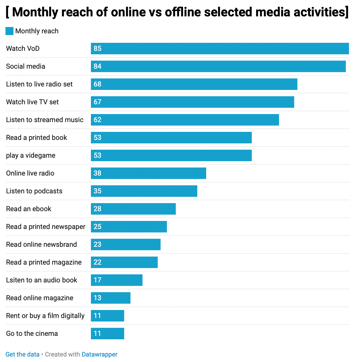 In Ofcom's report, when exploring monthly reach on selected media activities only, 11% of people reported going to the cinema, whilst 85% admitted to watching VoD monthly. This is a substantial difference, suggesting that the usage of VoD is more frequent and that going to the cinema is occasional. In the figure below, there is a clear trend for on-demand content being favourable to the audience. This is a factor that cinemas can't compete with, especially in today's digital viewing world.