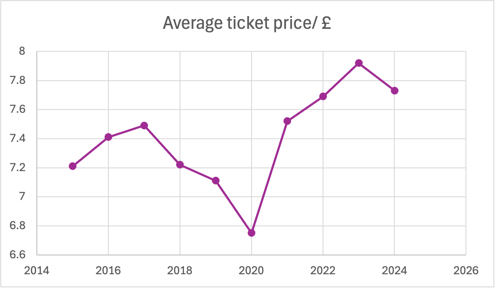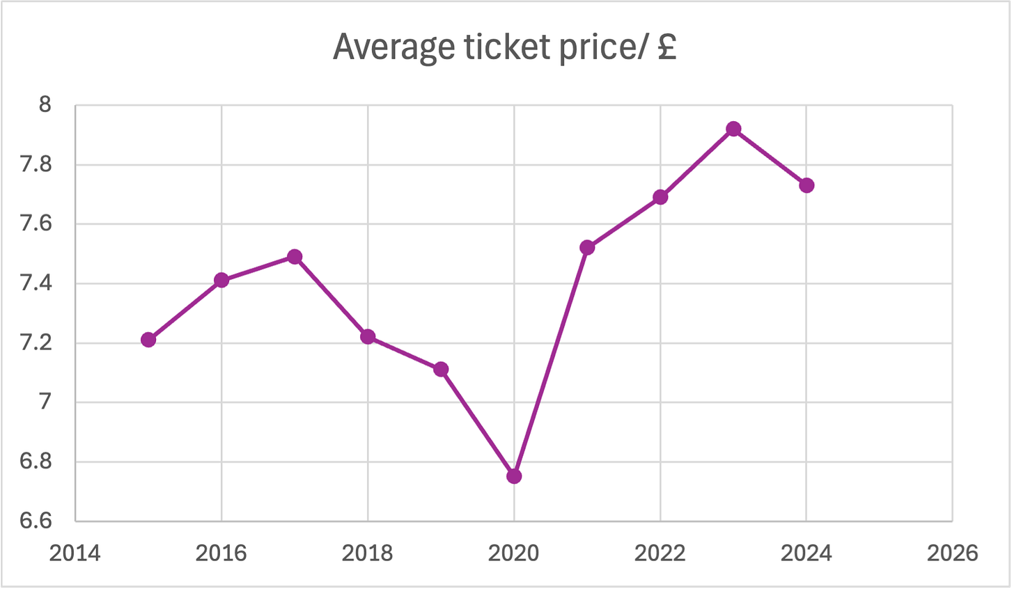 Cinema prices have marginally increased over the years, as seen in the graph below. In 2025 the average ticket price was reported to be £7.73, although -2.4% from last year, that is 0.62p more expensive than pre-COVID-19 prices. In comparison, Netflix’s standard subscription with adverts costs £4.99, for less than a cinema ticket, you can watch unlimited films and TV shows with ads for a month. Billy admitted that if the cost of cinema tickets decreased, he would be more inclined to go. The average annual spend per head has decreased since COVID, but is slowly rising again. With 2024’s average spend being £14.45, indicating that annually, people are attending the cinema twice. This is a 23% decrease from the pre-COVID spend of £18.72. With prices increasing and spending decreasing, although cinemas have reopened, audiences’ spending has not recovered. In a cost-of-living crisis, consumer demand is decreasing.