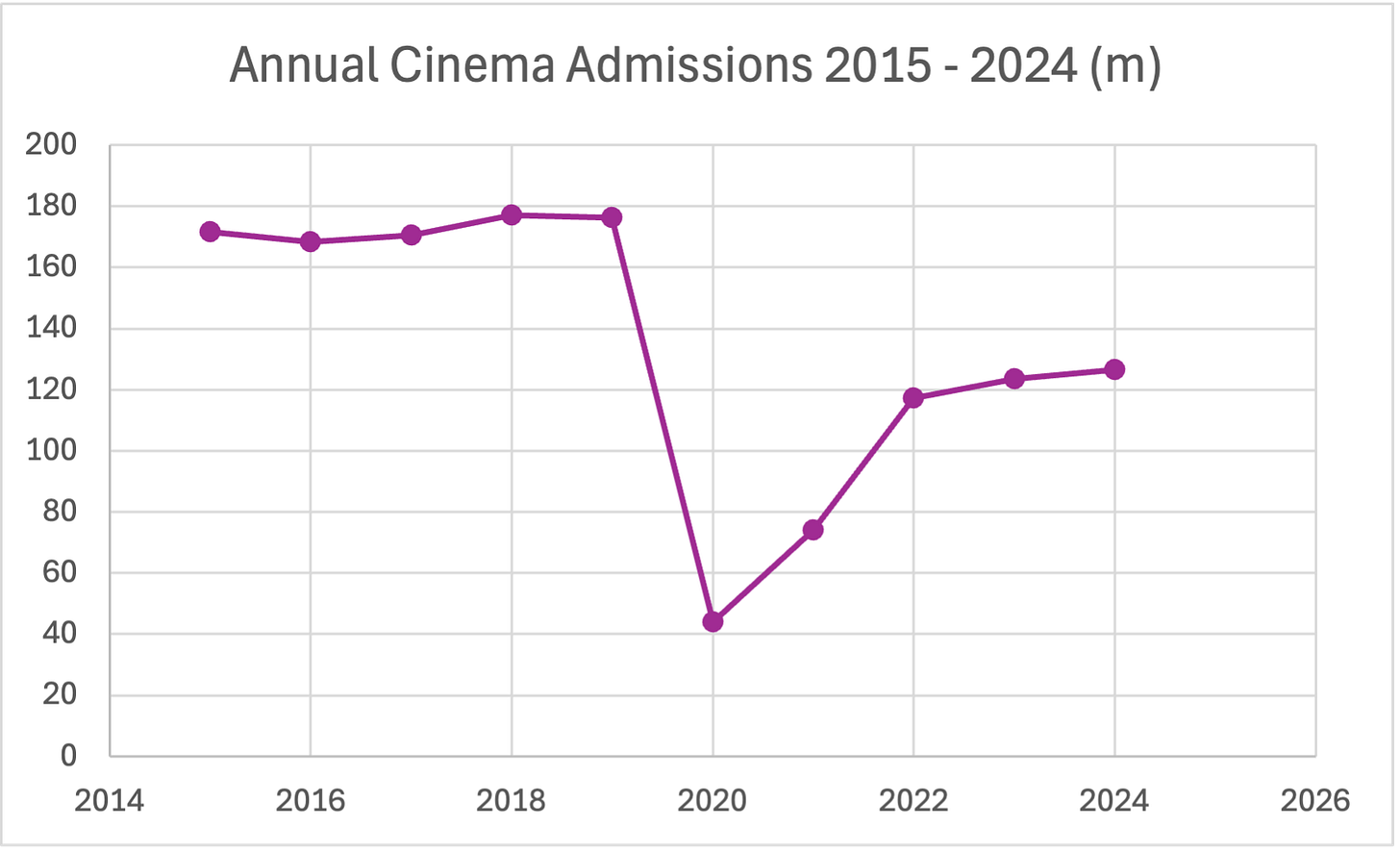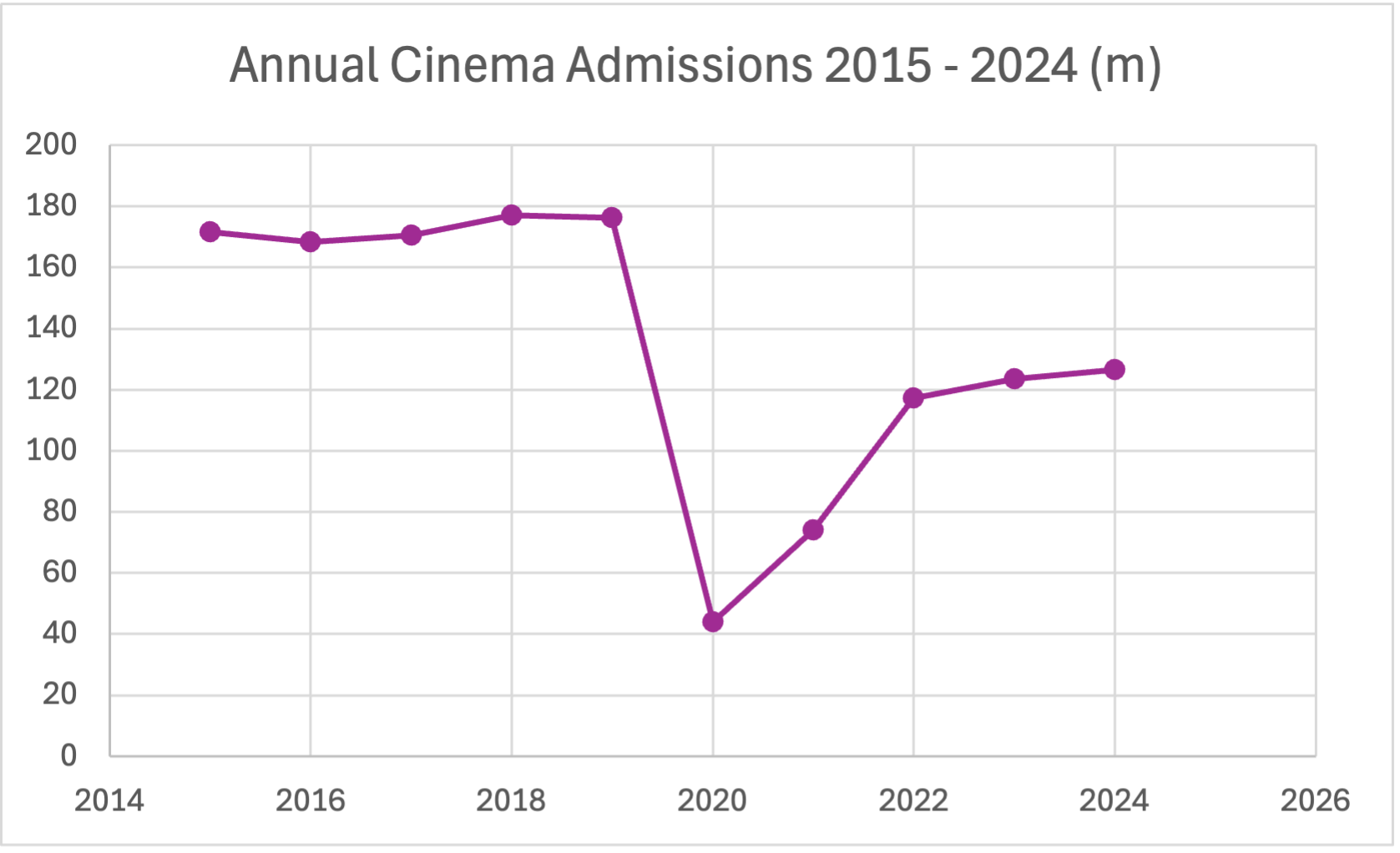 In 2024, 126.5 million people visited the cinema, this is a 2.35% increase from 2023. With COVID-19 finally in the past, cinema figures are starting to recover; they are slowly increasing but have yet to reach pre-pandemic figures. As seen in the graph below, the prolonged cinema closures during the national lockdown massively impacted the cinema industry, with a flatline of attendees as everyone subscribed to streaming services for entertainment. Following these events, some have gone back to watching films in cinemas, whilst others now prefer the comfort, conveniences and cost of at-home viewing.