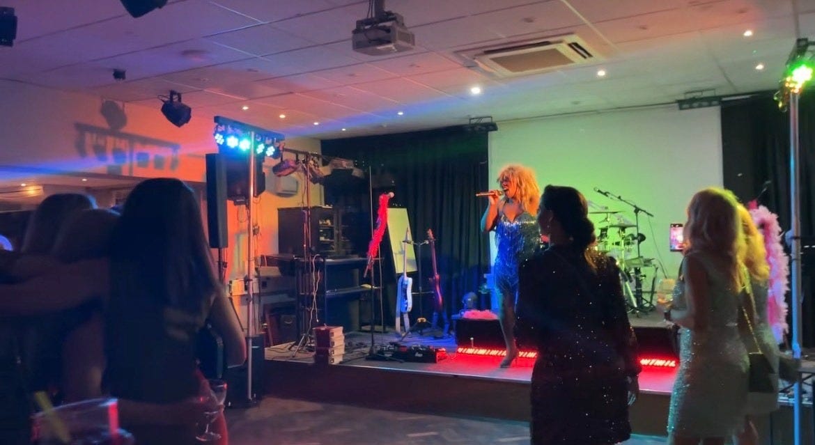 For Maureen, watching the event unfold is peacefully moving. It is a space that feels lighter than the one she remembers. The room was lit with pink lighting, with women wearing sparkly outfits, and glamorous makeup, representing their proud femininity. As the Tina Turner tribute was warming up, I took the opportunity to interview the women behind the glitter.