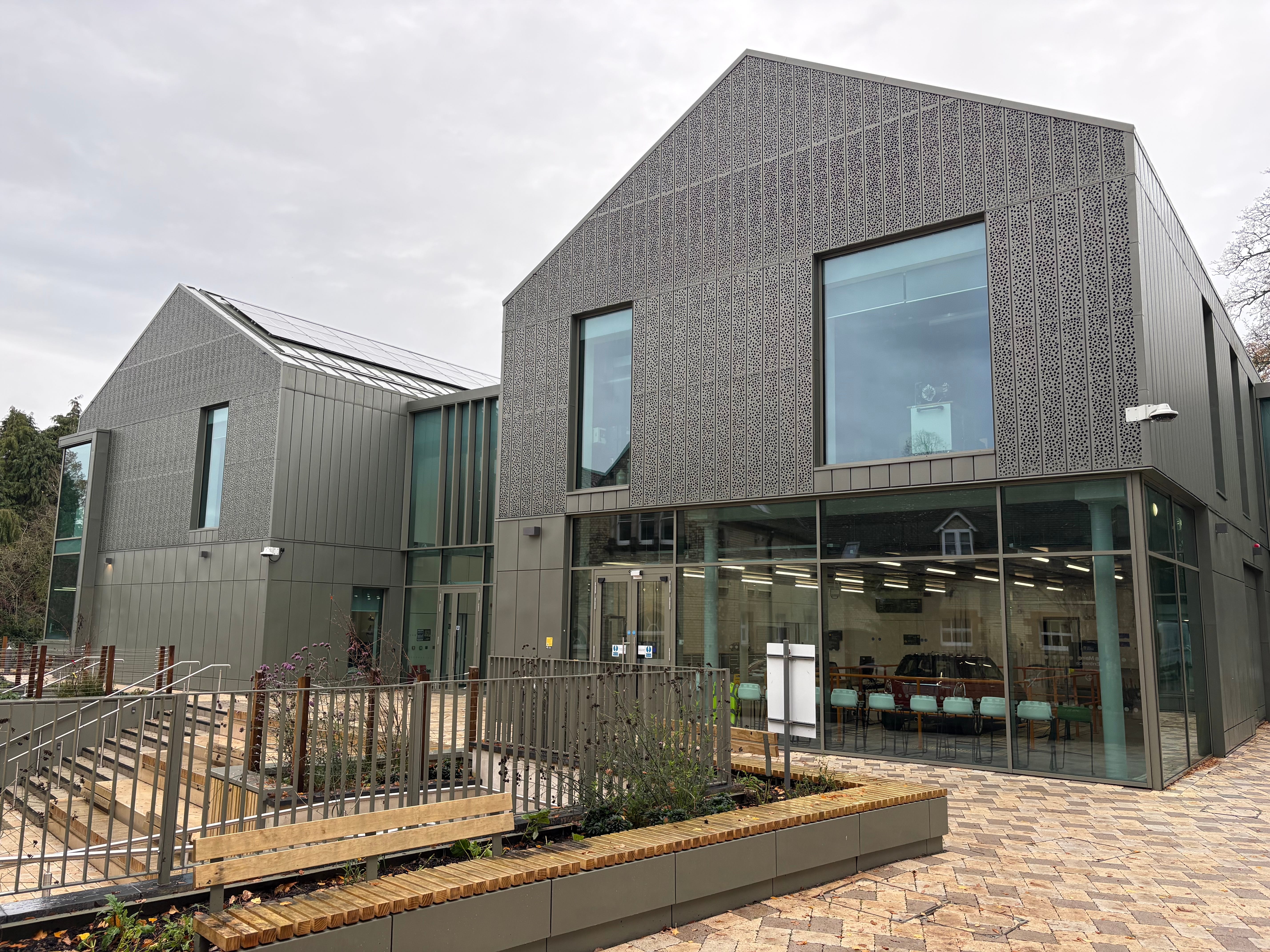 The Oxford Preservation Trust wrote that the building’s “gabled form echoes the other buildings in the historic setting, while the textured zinc cladding reflects the parkland setting and mitigates the impact of louvred ventilation hidden behind the façade.”