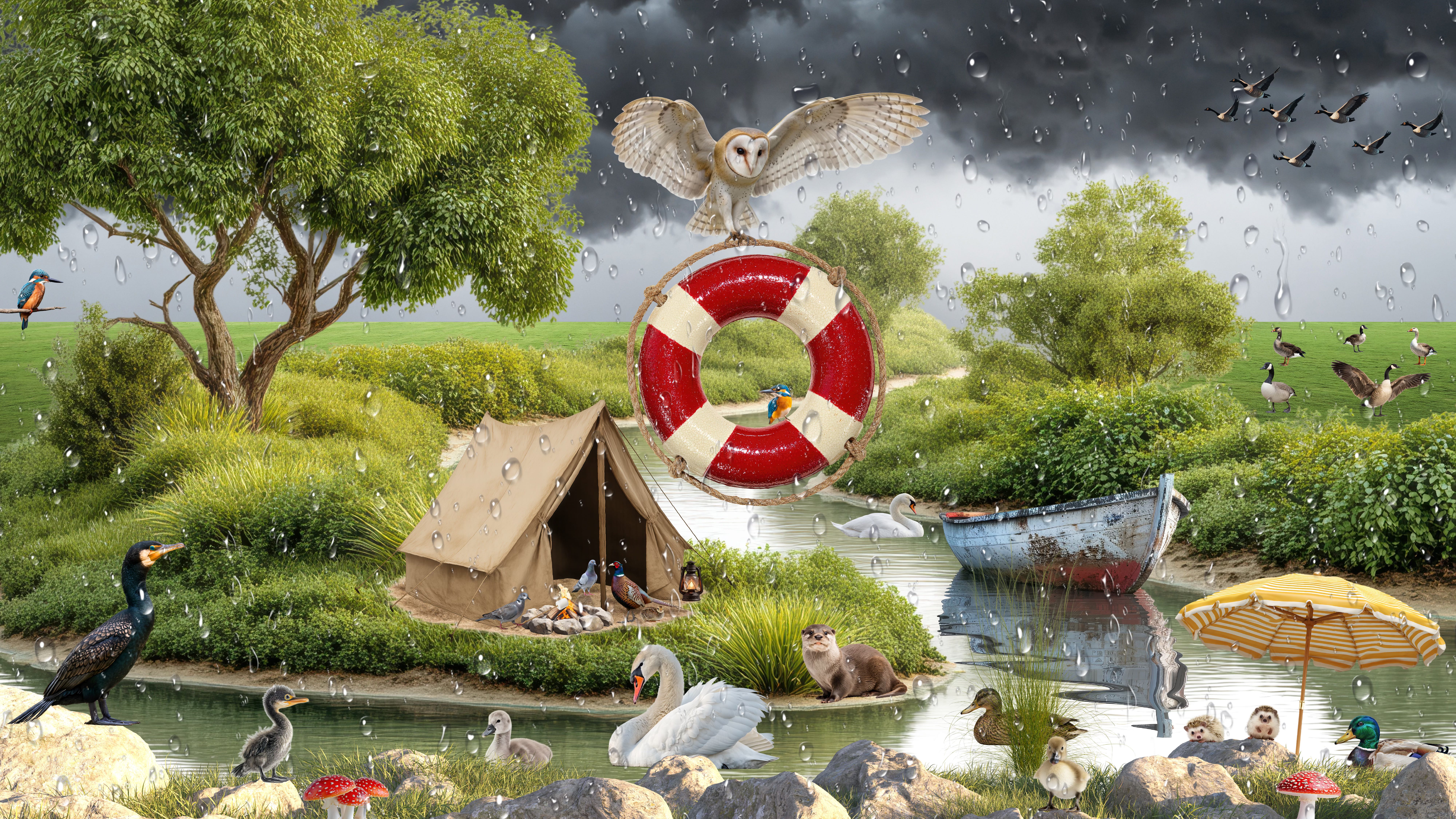 ‘I can hear another kingfisher,’ Neil says, picking out a faint, high-pitched call nearly lost beneath the rush of the river and the rain beginning to fall.