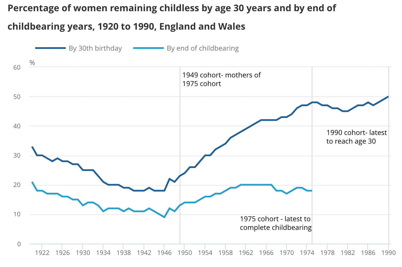 More women in higher education and the workforce, later marriages, precarious housing markets, mounting childcare costs, and a general feeling that we need to have our lives sorted before adding another one to the mix are some of the many factors at play here.