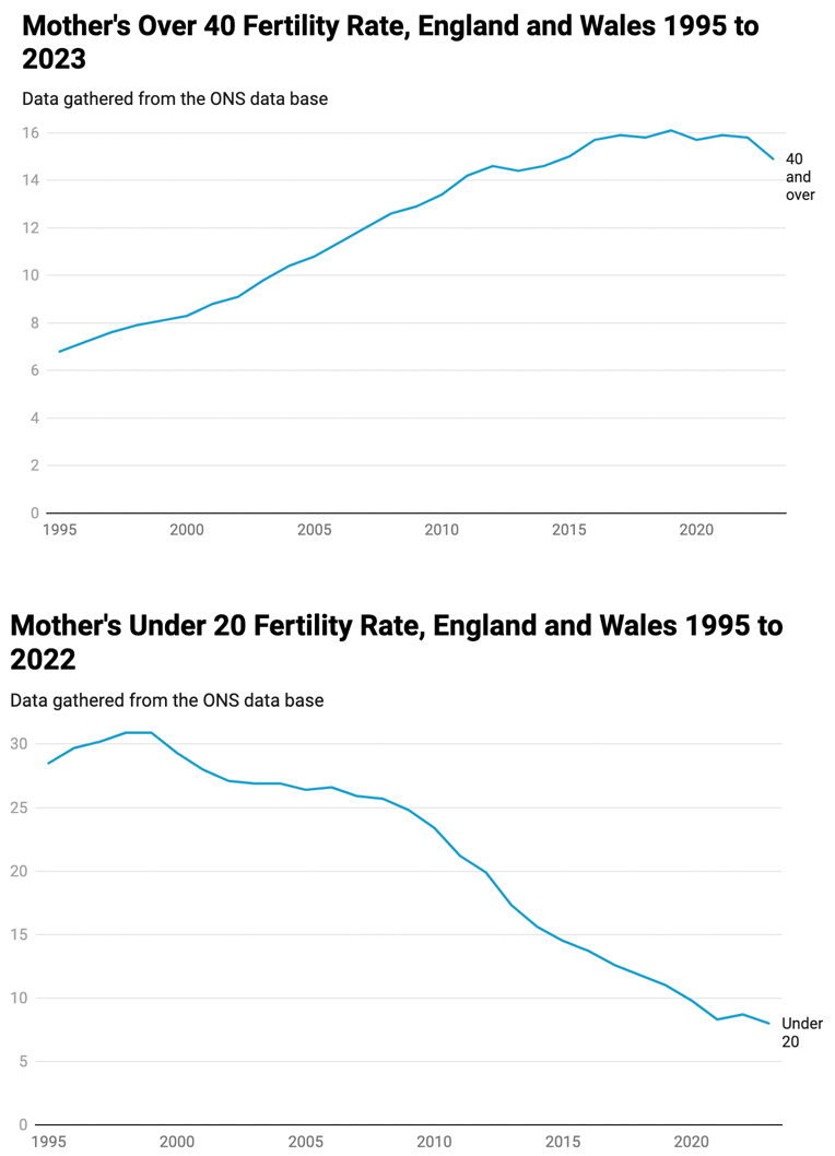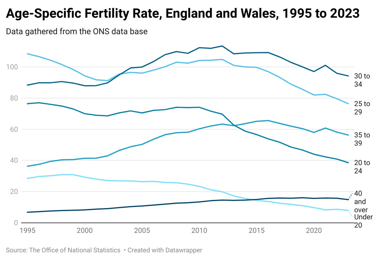 In 1997 - the year I was born - the most common age group for births was 25–29, with over 104 babies per 1,000 women in that range. By 2022, that’s dropped to just 79.6.