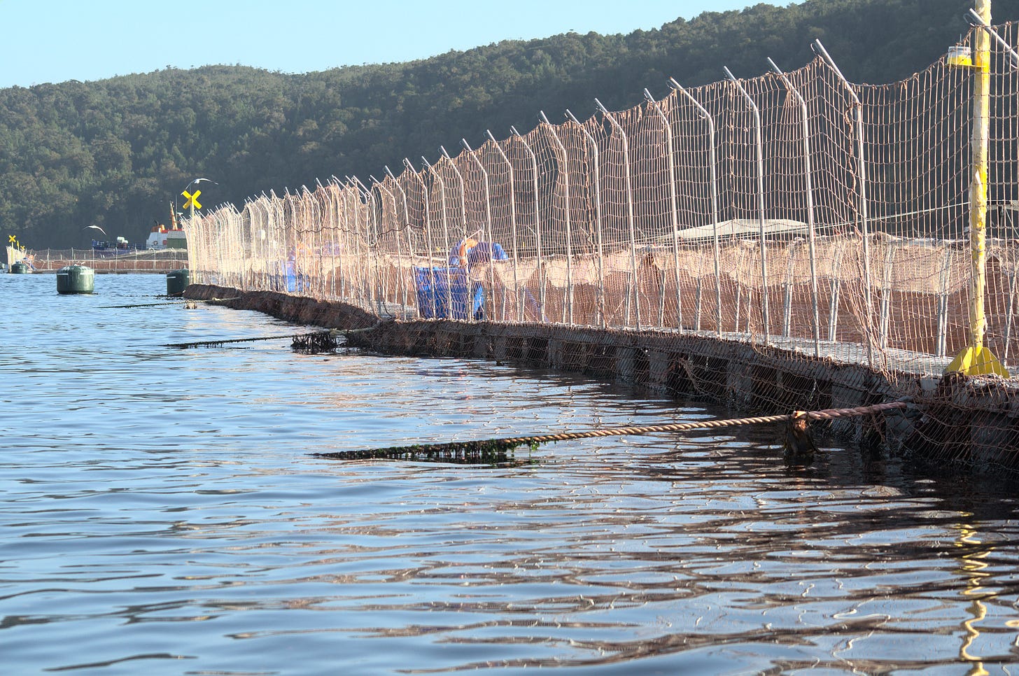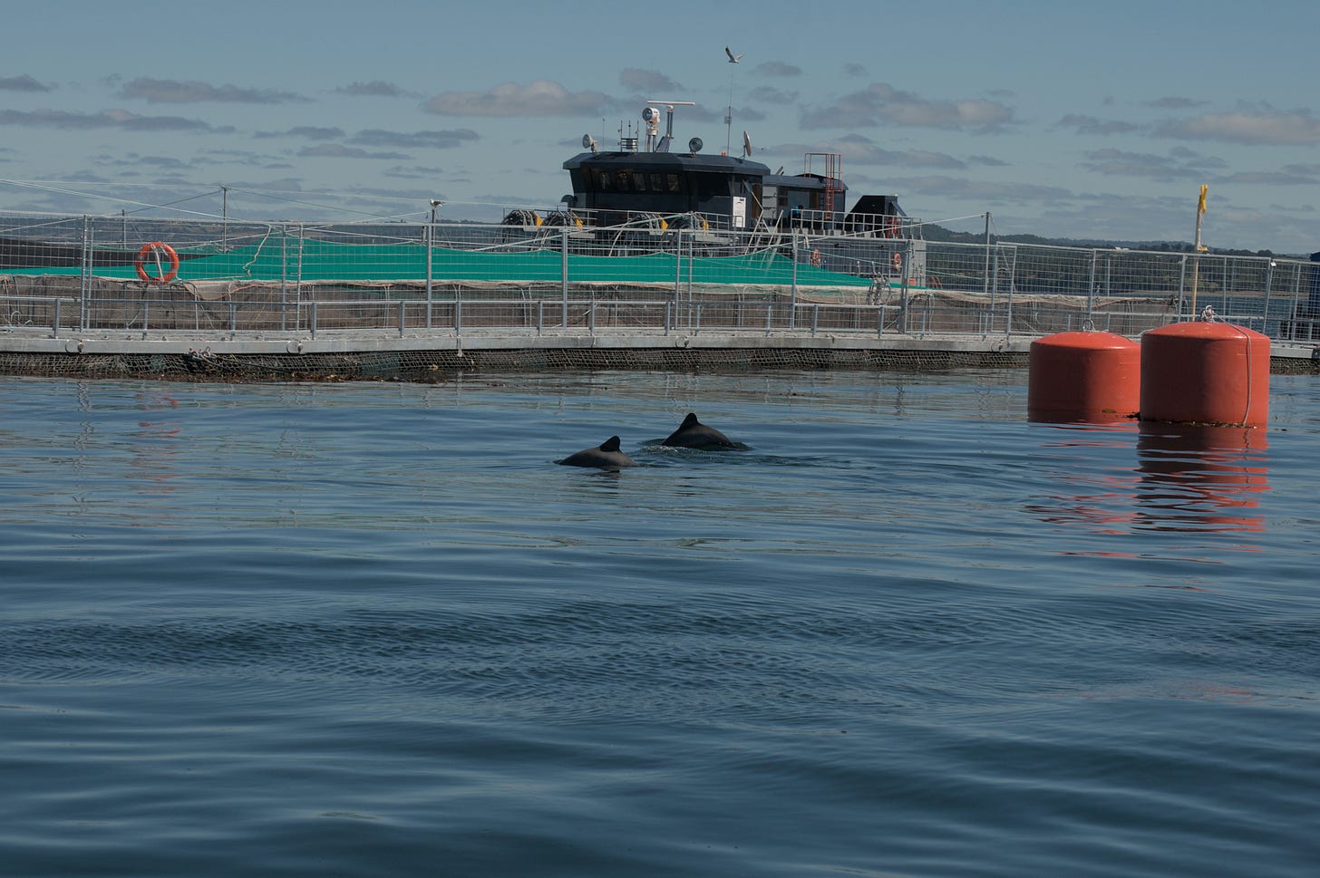 We could observe salmon farm fishing nets all around the bay. However, these nets do not just look invasive to the eyes - as we discovered they are one of the main threats to the dolphin population.