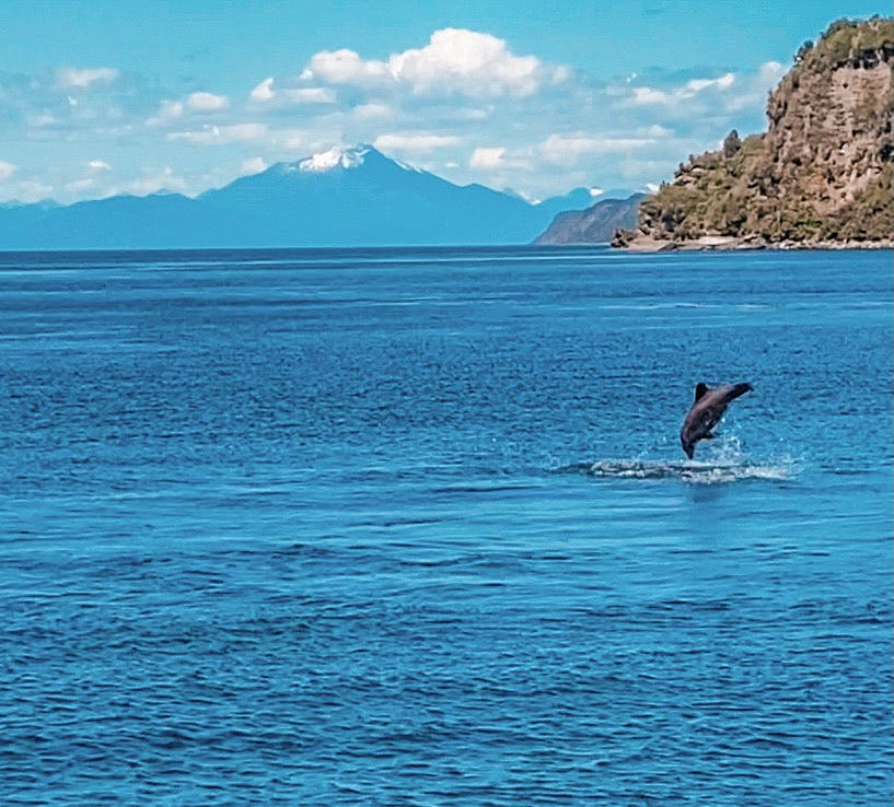 To our surprise, after a few minutes, we spotted a group of Chilean dolphins coming close to the boat while performing tricks to call our attention, leaving not just us, but our guide stunned, as he had not seen such friendly behaviour before.