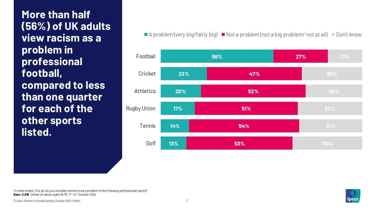 A poll conducted in October 2024 by Ipsos found that 56% of UK adults view racism as a problem in professional football. Given the spotlight of professional football, the problems are easier to spot under the cameras and lights of the top game, but when most grassroots games consist of one man and his dog for spectators, it makes it a lot harder to police.
