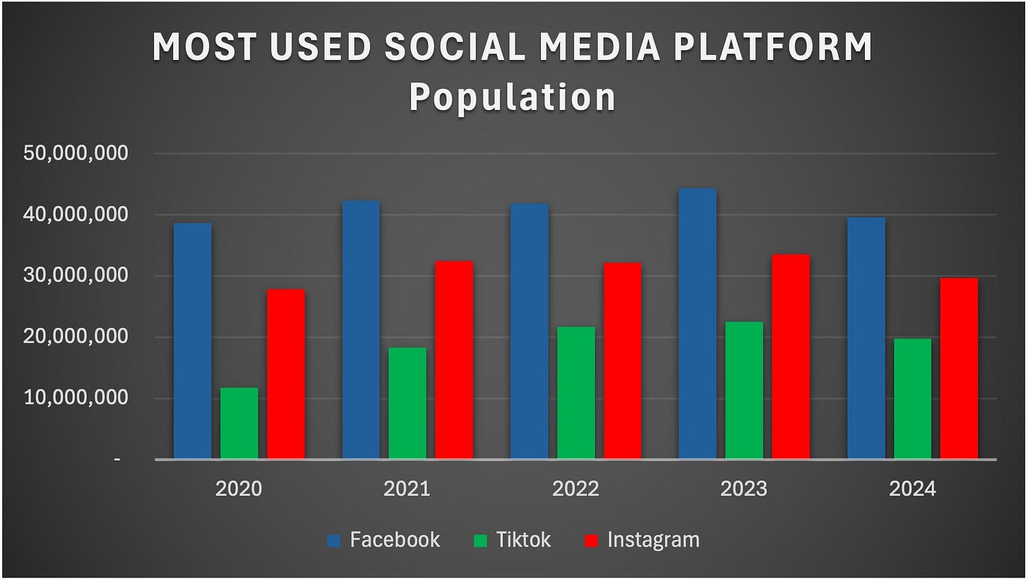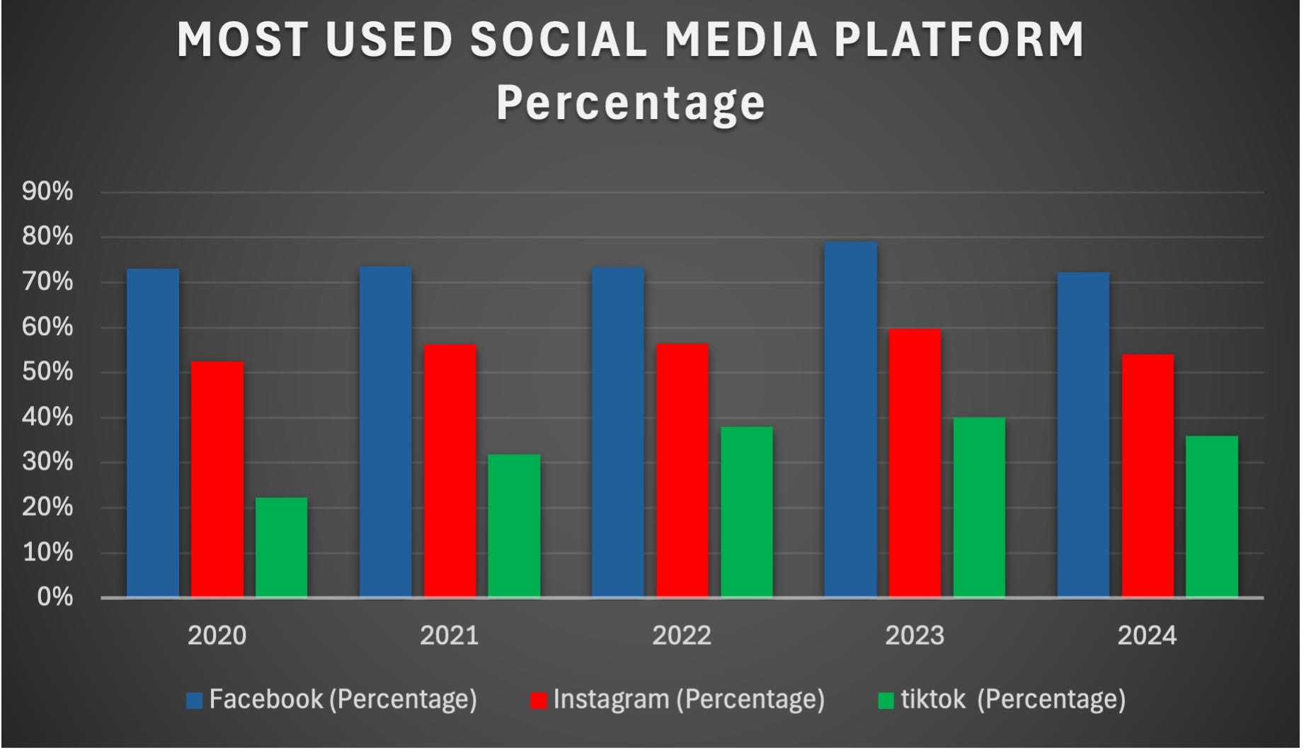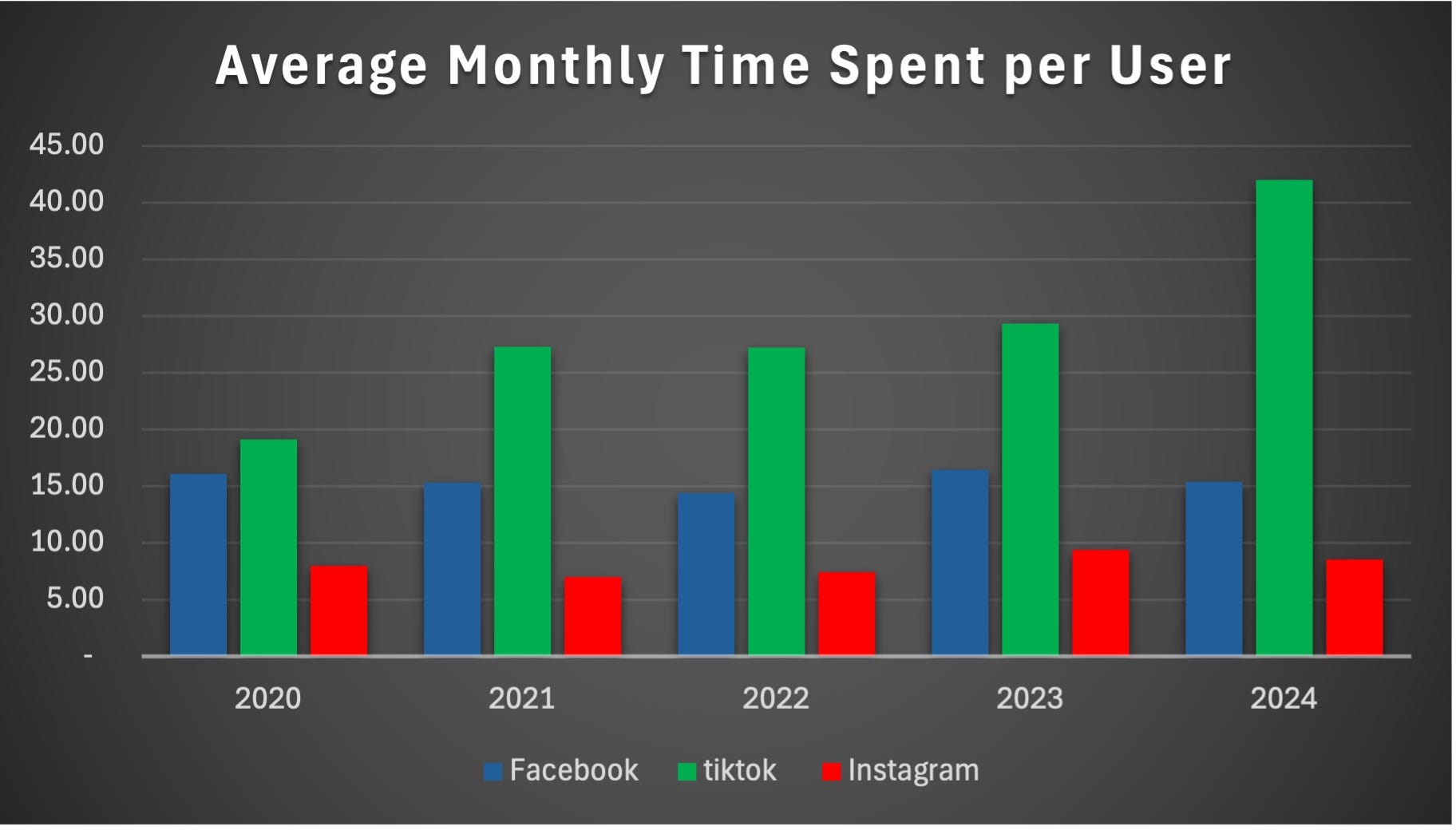 What’s even more striking is the engagement gap. In 2020, TikTok users already spent more time on the app each month (19.1 hours) than Facebook (16.1 hours) or Instagram (8 hours). By 2024, the average TikTok user was spending a remarkable 42 hours per month on the platform, nearly tripling their engagement in just four years. Facebook’s average monthly user time remained relatively flat, hovering around 15–16 hours, while Instagram’s numbers stayed below 10 hours.