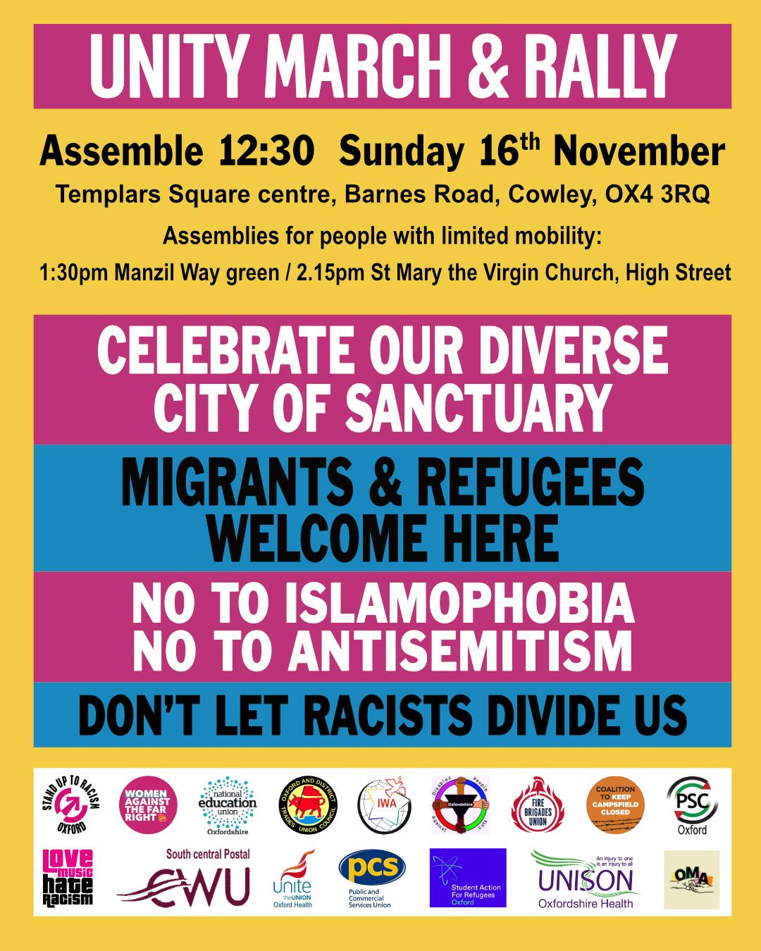 Oxford is set to hold a Unity March and Rally this Sunday, November 16, 2025, to promote inclusion and an anti-hate message. The event will begin at 12:30 PM at the Templars Square Centre, Barns Road, Cowley, with participants marching together to Bonn Square for a rally celebrating Oxford as a City that welcomes migrants, refugees, and people of all backgrounds.