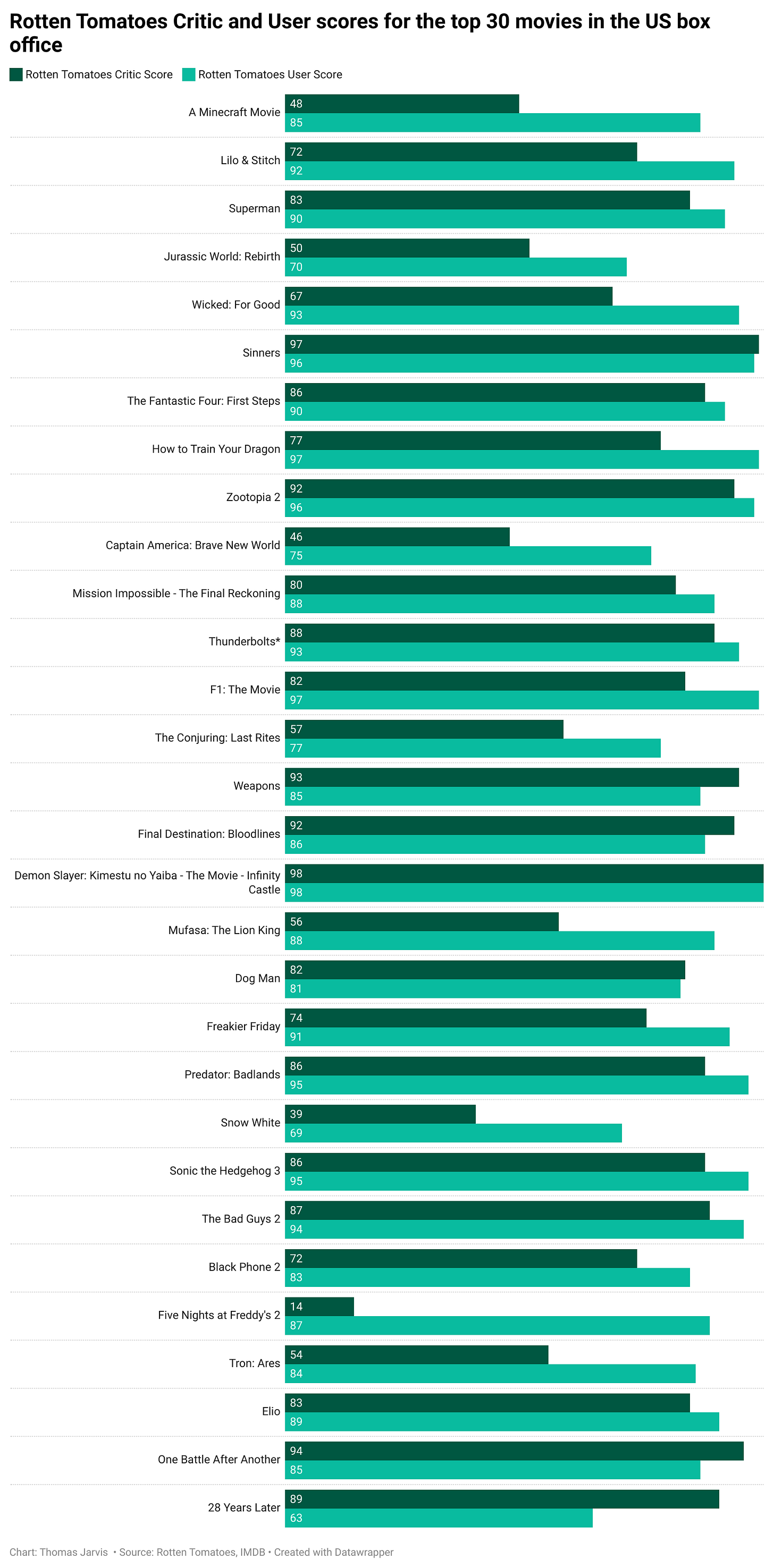 This data paints an interesting picture about the nature of the type of movies that become a success in the US before we even discuss the Rotten Tomato scores. From the top thirty only three movies: Elio, Sinners and Weapons with every other film on the list being some kind of sequel, adaptation or cinematic universe continuation.